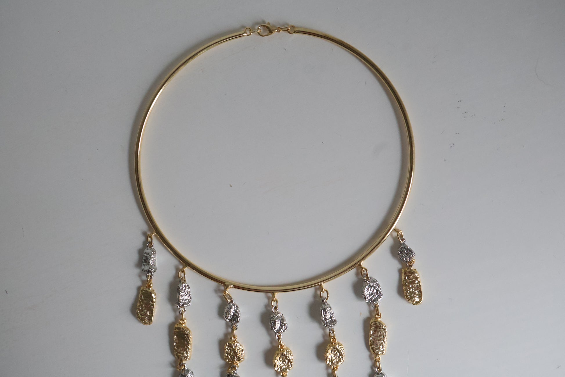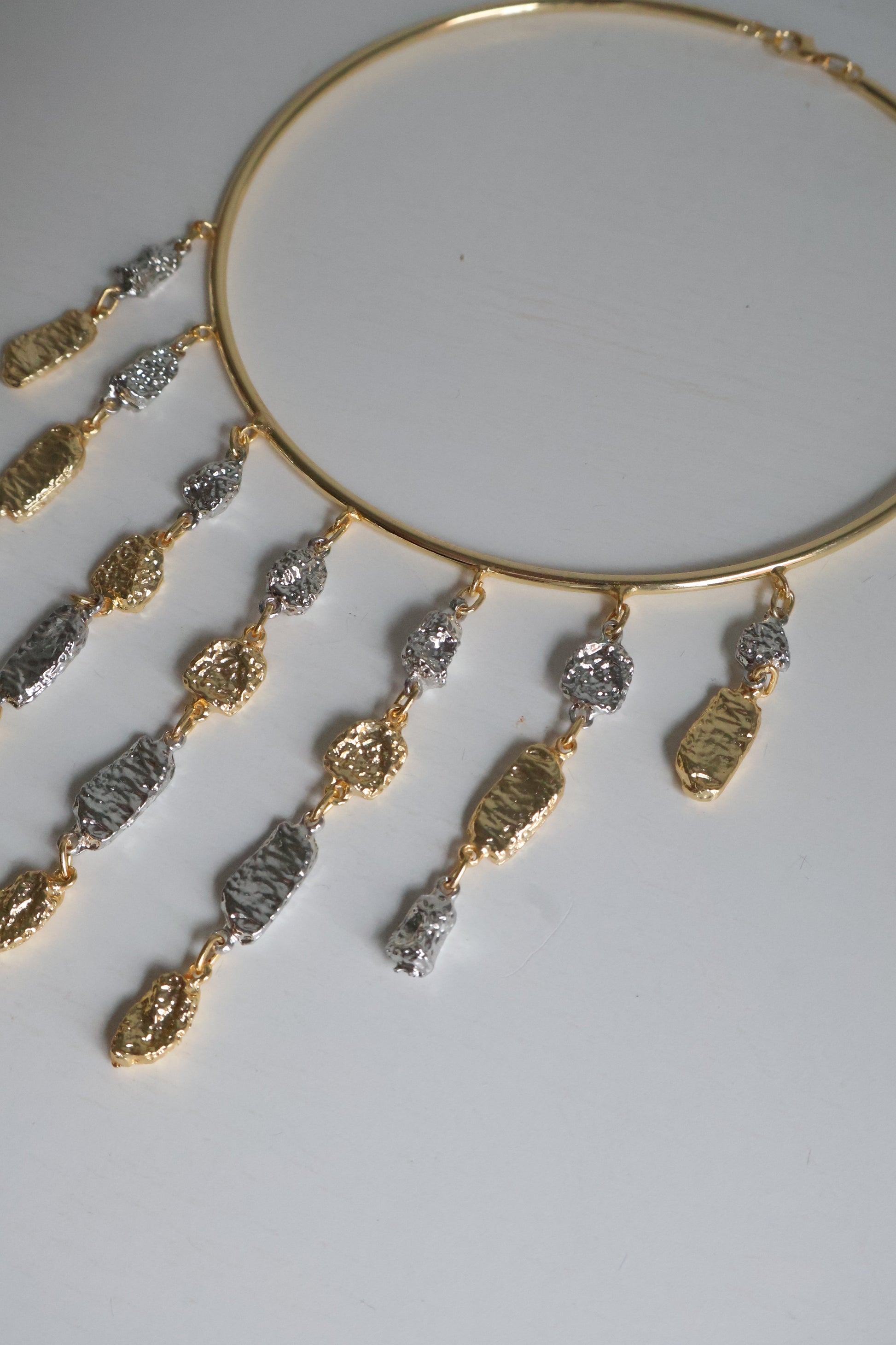 This bold statement necklace brings modern elegance with a touch of glamour. Featuring a sleek gold-plated collar and cascading textured charms, it creates a striking silhouette that catches the light beautifully. Designed in three unique dangling charm variations, each piece keeps the same elegant alignment while offering a distinct character. Luxurious gold-plated finish Contemporary yet timeless design Lightweight and comfortable for all-day wear Perfect for evening wear, weddings, and special occasions An eye-catching piece that elevates any outfit, ideal for customers who love unique and artistic jewelry.